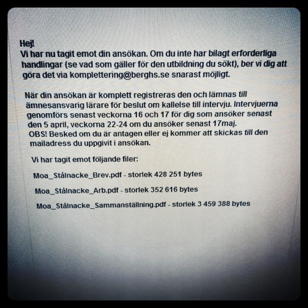När jag kom ut från Nationalmuseum hade jag ett missat samtal. Ringde upp ett mystiskt nummer för att få reda på att “Johanna är på lunch” Efter att ha googlat febrilt insåg jag vem Johanna är. BOOOM, klockan 13:37 fick jag reda på att Jag Moa (Charlotta Karma) Stålnacke härmed är kallad till intervju på BERGHS på torsdag kl 13:00!