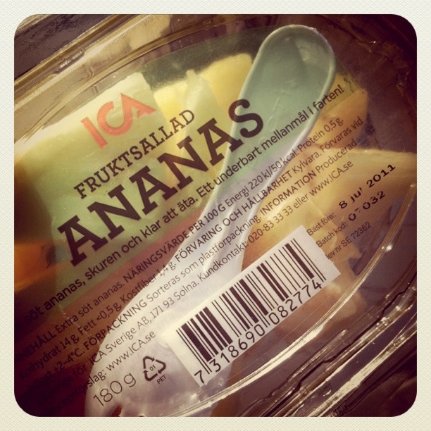 Solen skiner idag också, så imorse skyndade jag mig till Ica för att hämta ut mina sprillans brillor – bara för att upptäcka att leverantören skickat fel modell i fel färg. Jag behöll senilsnörena och hivade fort som tusan tillbaka brillorna, besviken och bländad. Så när “verkligheten” sagt sitt släpade jag mig istället ner till Solo och plockade upp rätt modell i rätt färg där (i en butik, kort i taket!) Sen gjorde vi debut längst Kungsgatan och hem. Med undantag för ett kort stopp på min nya favorit, Ica to go, för ananas.