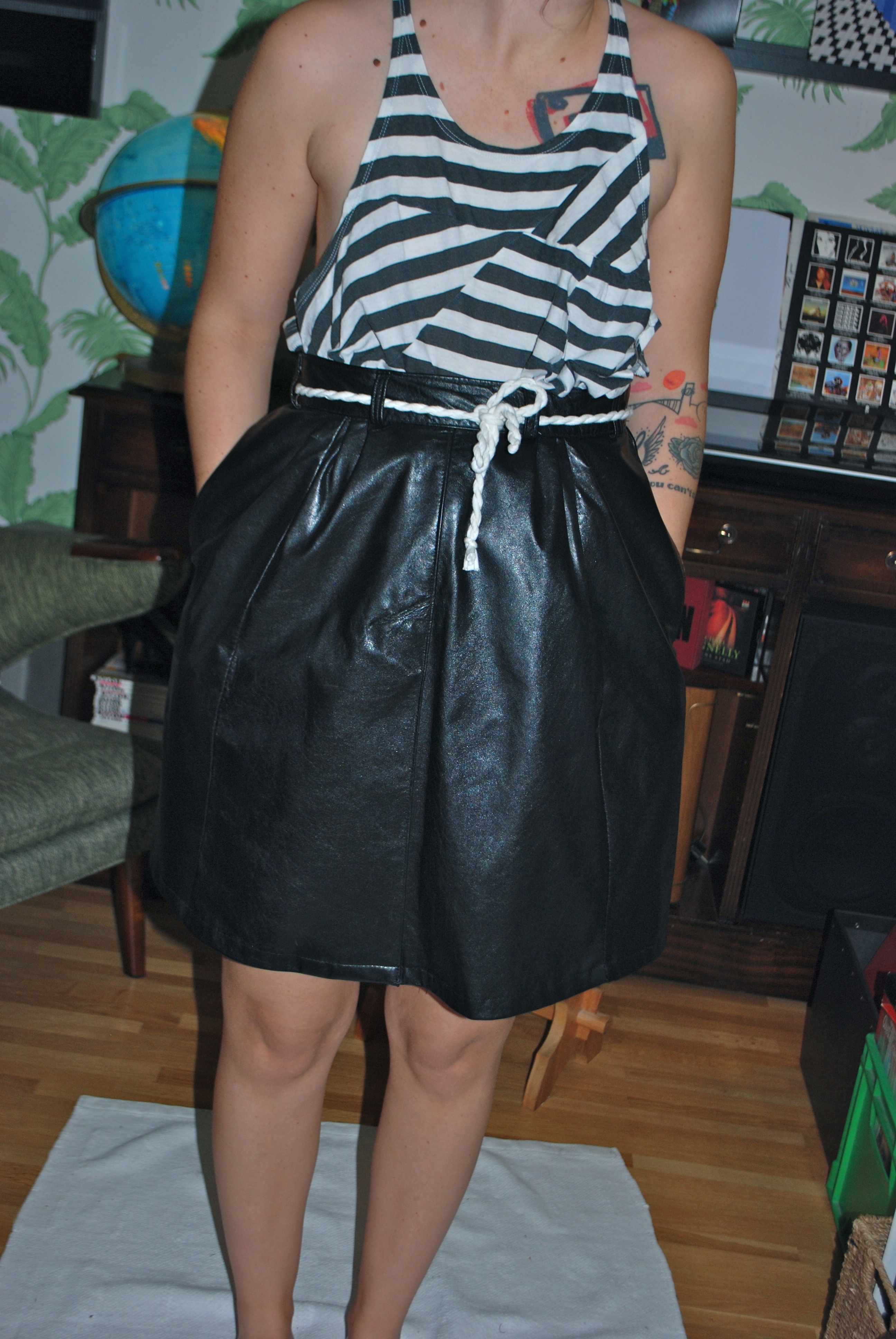 Läderkjol jag kortat av hos skräddare. Som ny. Oklar storlek, uppskattar den till 32-34. 150 kronor.