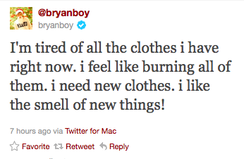 My aunt reminded me of this vintage Hemés scarf I got from her many, many years ago (FYI – Etsy has some great pieces right now) During this week I got plenty of vintage pieces from her, so happy! She is one of my biggest insperations when it comes to style and all the items I recived makes me feel like a princess. I’m thinking I’ll show them off to you – a minor step in the “fight” against fast food consumtion. It makes me sad when people don’t cherish what they got, for me (now) it seems so silly to buy stuff you don’t intend to love and use for a long time. Such a waste! I adore Bryanboy for his curage to step away from what men “are supposed to” dress like, and I always get so happy when I see him around Stockholm, but this tweet (ignoring it’s irony)… makes me feel a bit hopeless. What do you think? How do you reson when out shopping?