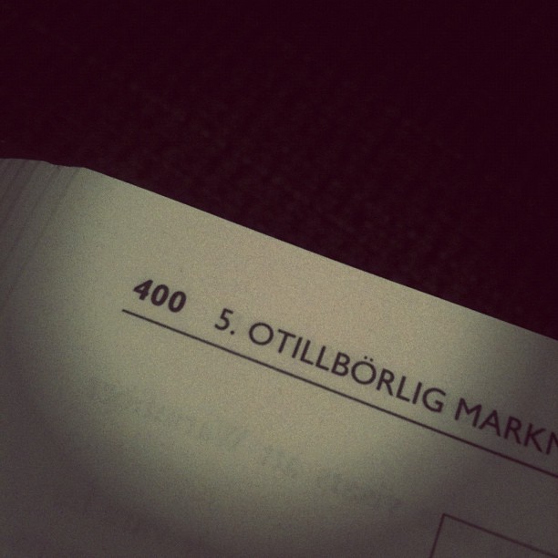 Nu är så inte fallet. Istället vaknade jag till att min kropp hade lagt av, svårt att förklara – men så var det i alla fall. När jag väl låg där slogs jag av min egen frustration, att min kropp redan efter en vecka tillbaka i skolan sa ifrån. Det har hänt några gånger förr, även om det var länge sen sist nu. Det är som om min kropp stannar mig när jag lever lite för snabbt. Då lägger den av och det finns inget annat att göra än att spela med. Idag lyckades jag hur som lura den lite där jag låg, lyckats plöja en hel del marknadsrätt (hade nästan tappat hoppet om att få se sida 400) och fixa en fotograf till ett samarbetsprojekt jag arbetar med. Jag tänker att min kropp skall ge mig “a break” nu när jag ändå är lite mer i fas, känner att jag har lite mer kontroll.
