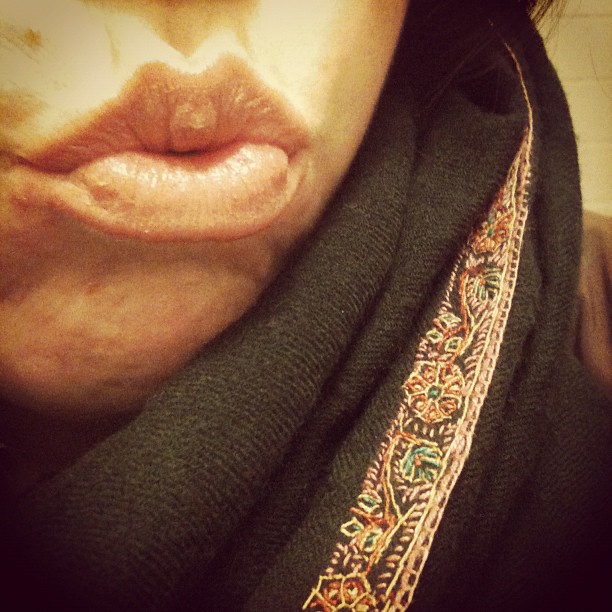 Vid en första anblick ser tavlan ut som en gigantisk religiös ikon, men med den stora skillnaden att modern bär en grotesk gasmask och jesusbarnet har munskydd och håller i en burk läsk.