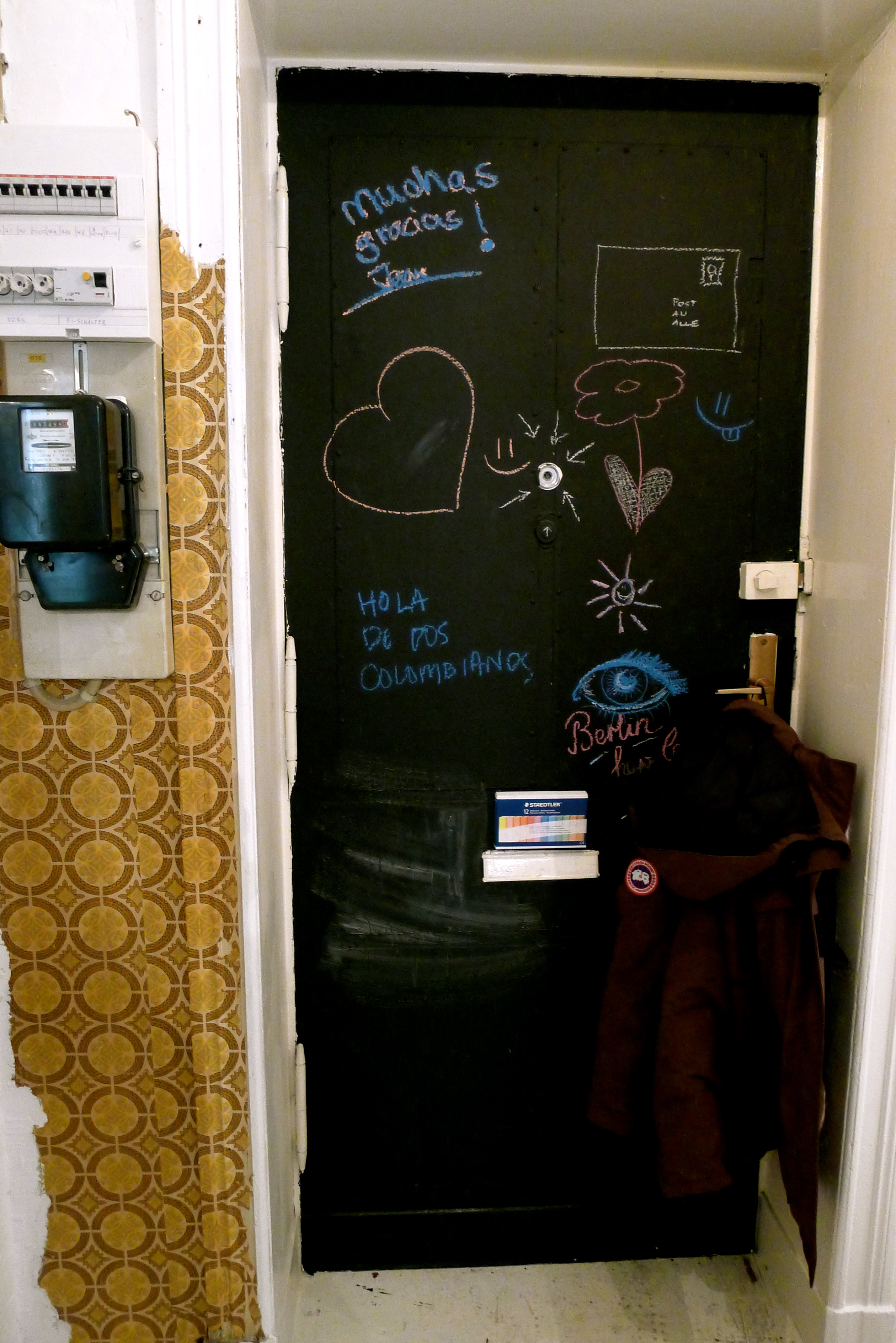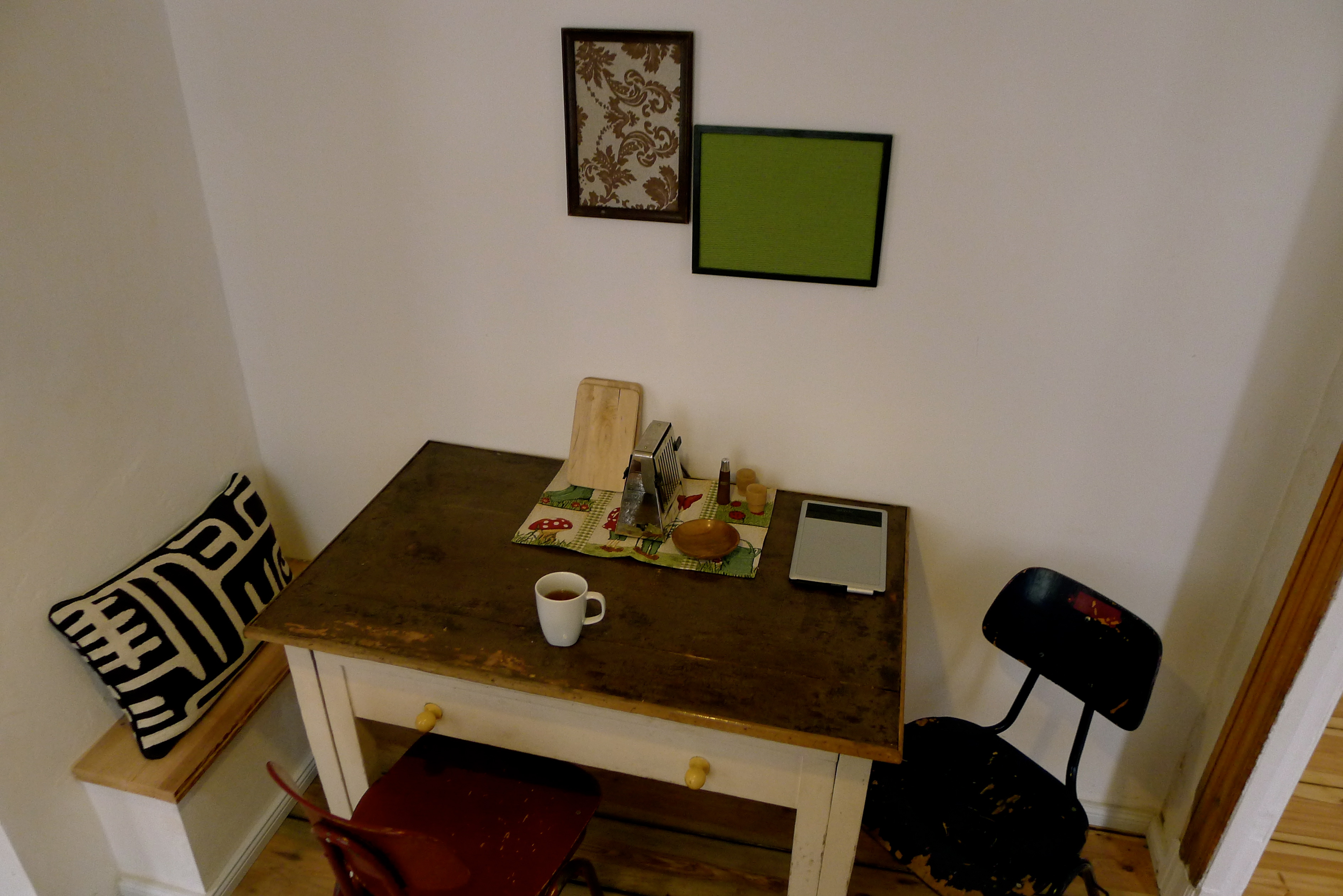 Tavelväggen intill matplatsen kan sammanfattas som Moas och Gustavs livsverk, fylld av samlade minnen. Här blandas bröllopspresenter och soprumsfynd med tavlor som kompisar har målat, affischer från konstutställningar, ärvda spegeltavlor och bilder som följt med hem från resor runt om i världen.