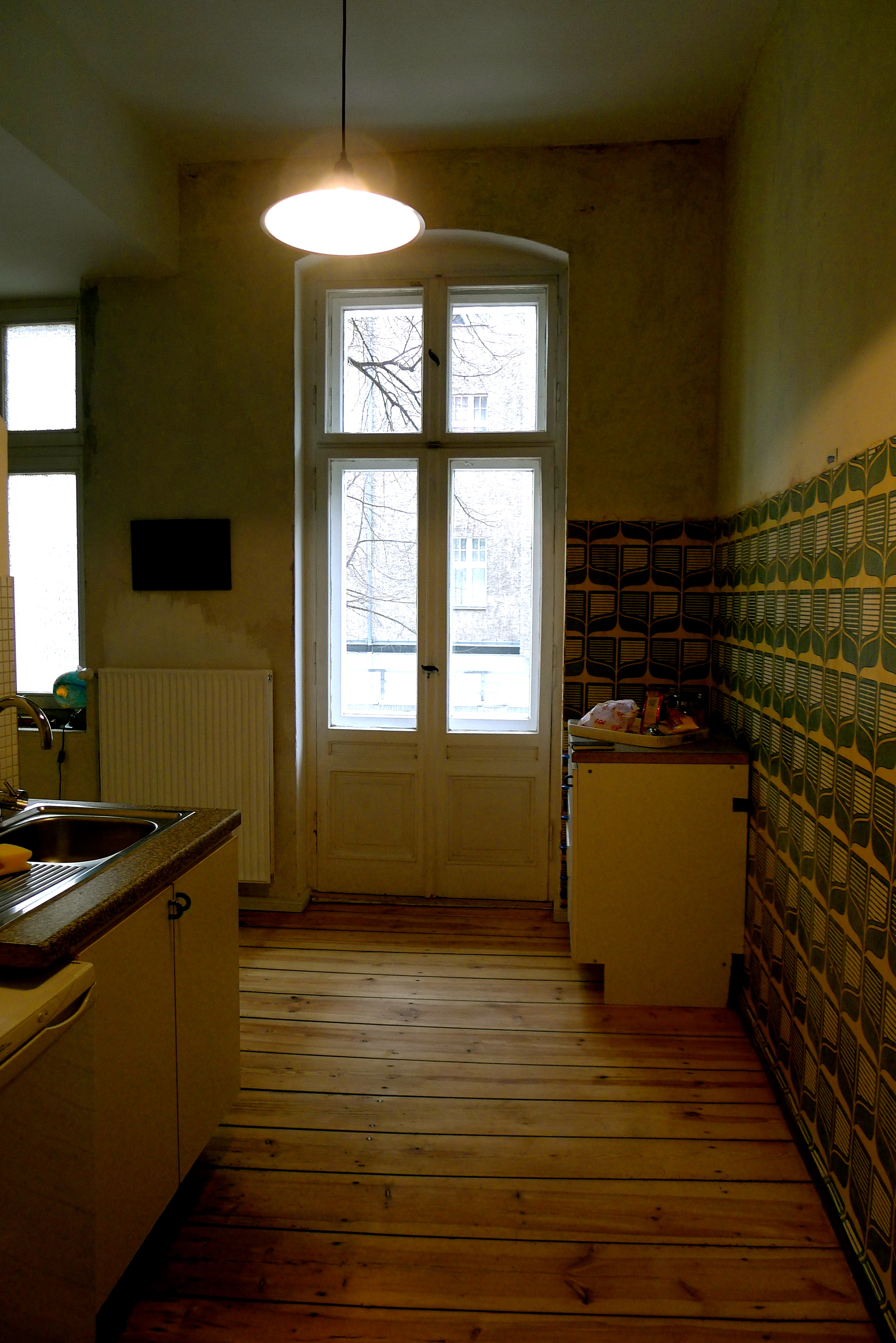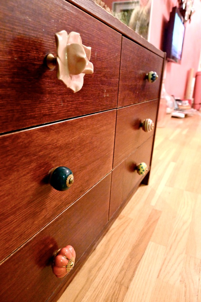 På den första rundvandringen genom lägenheten ställde sig Moa och kramade det platsbyggda serveringsskåpet. Hon hade hittat gamla rester av blomsterdekor på ett av hyllplanen.