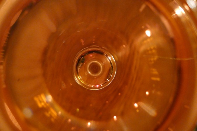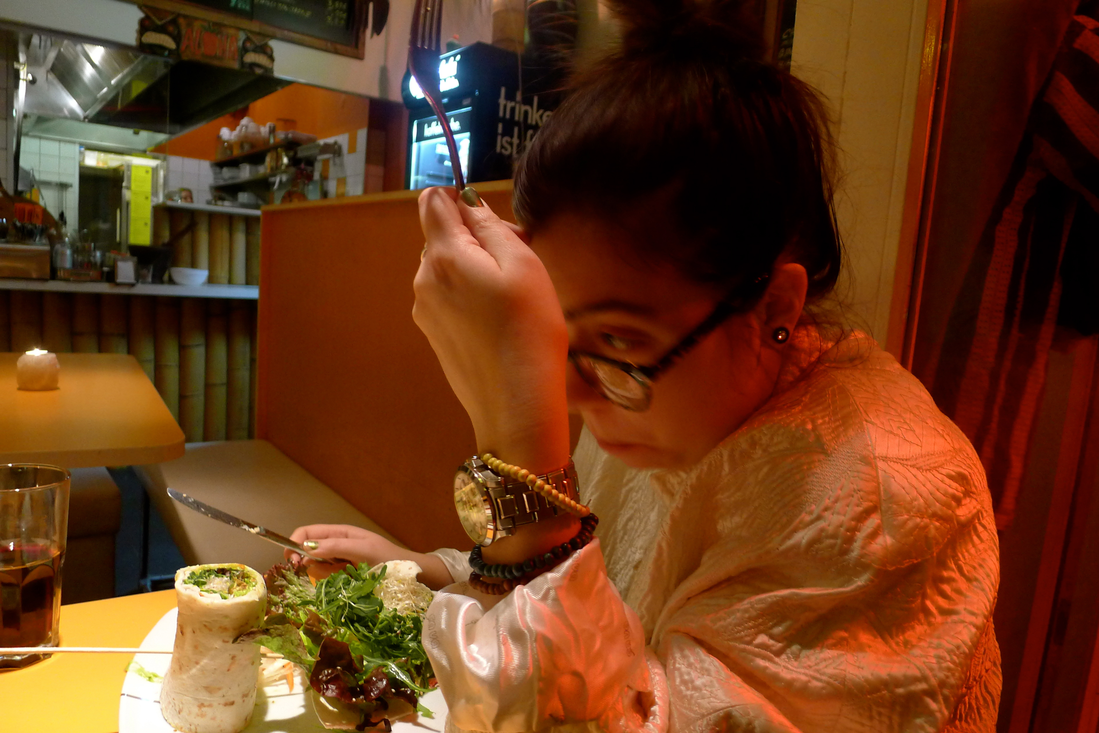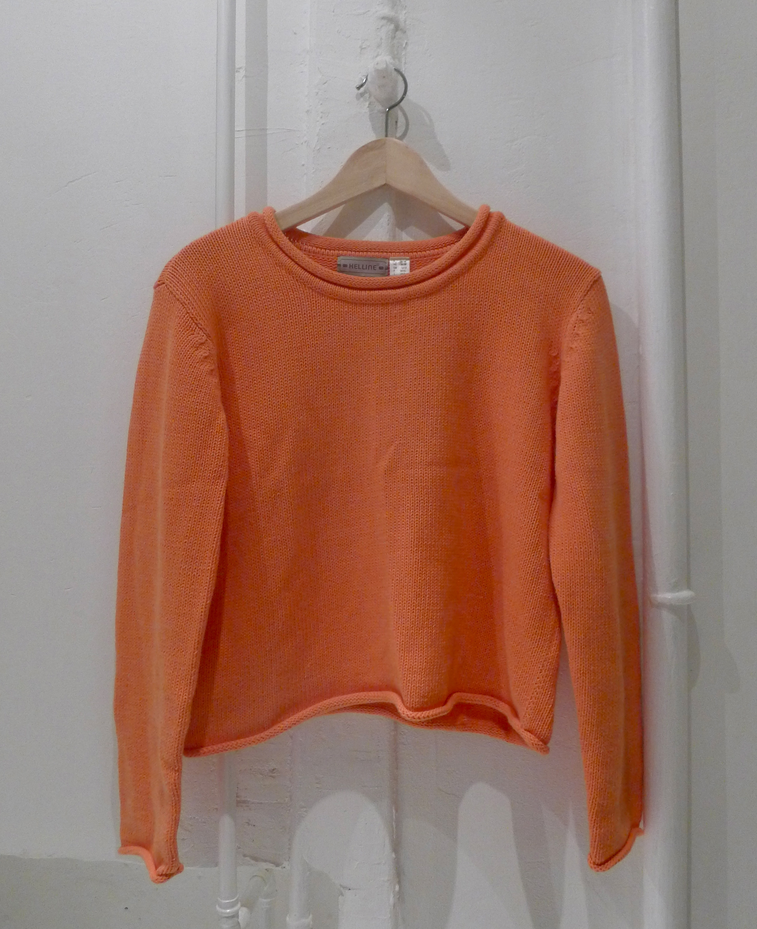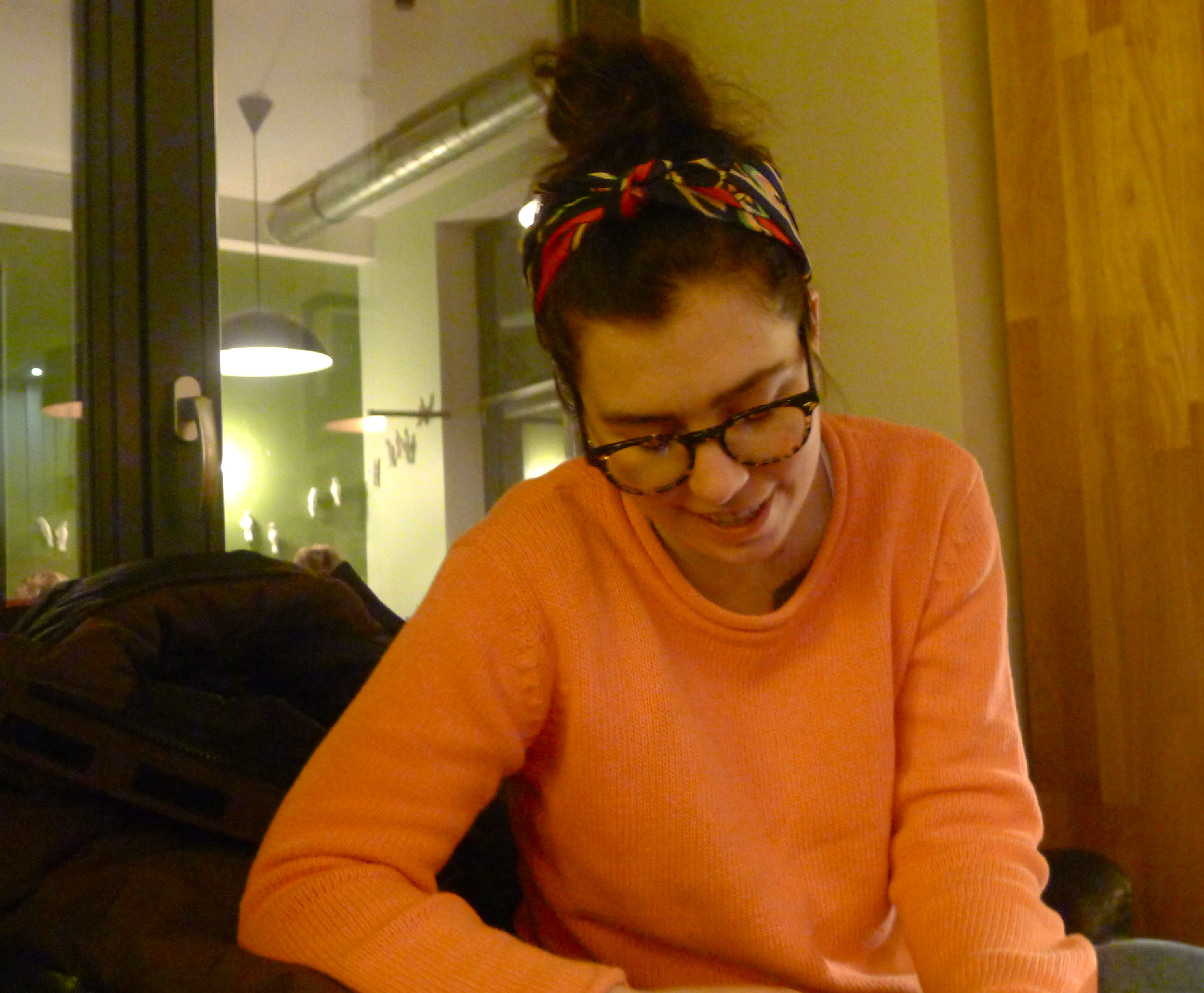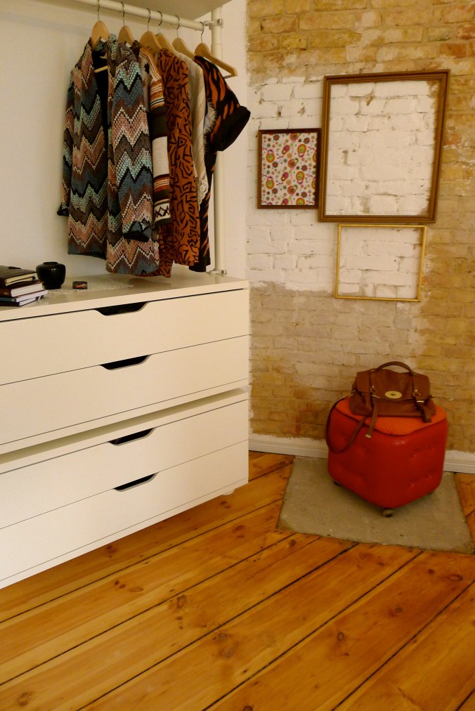 Hon har haft en tanke om att allt ska gå igen någon annan stans i lägenheten. Det orangea från elementet går igen i en lampsladd över matplatsen och stearinljus i köket, i varje rum finns något i mässing och koppar.