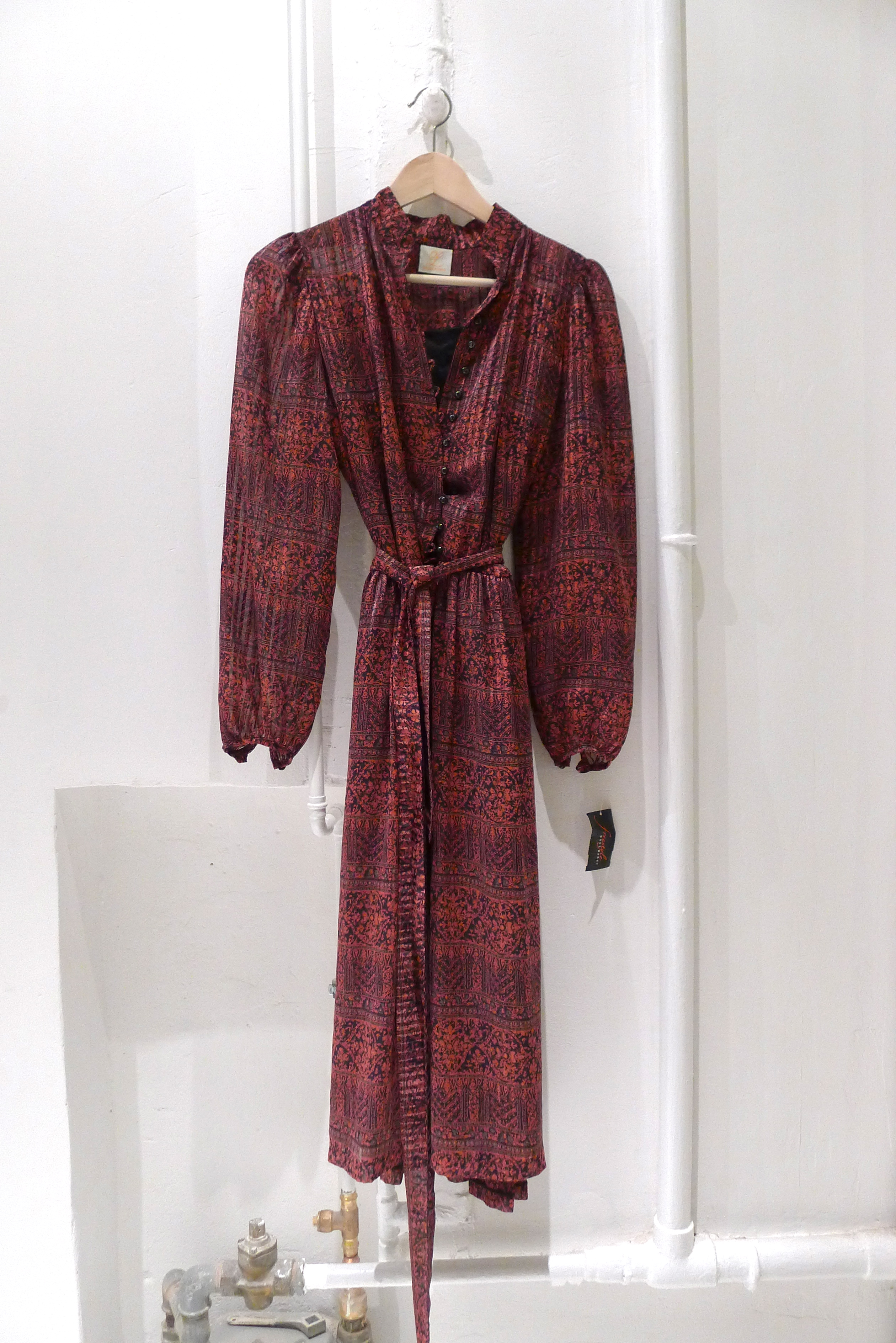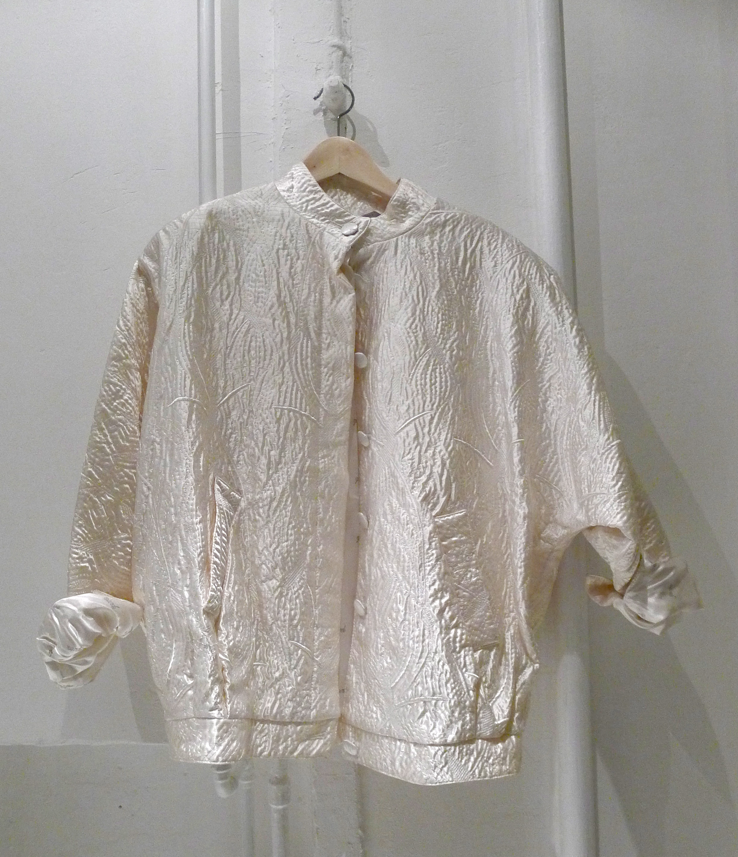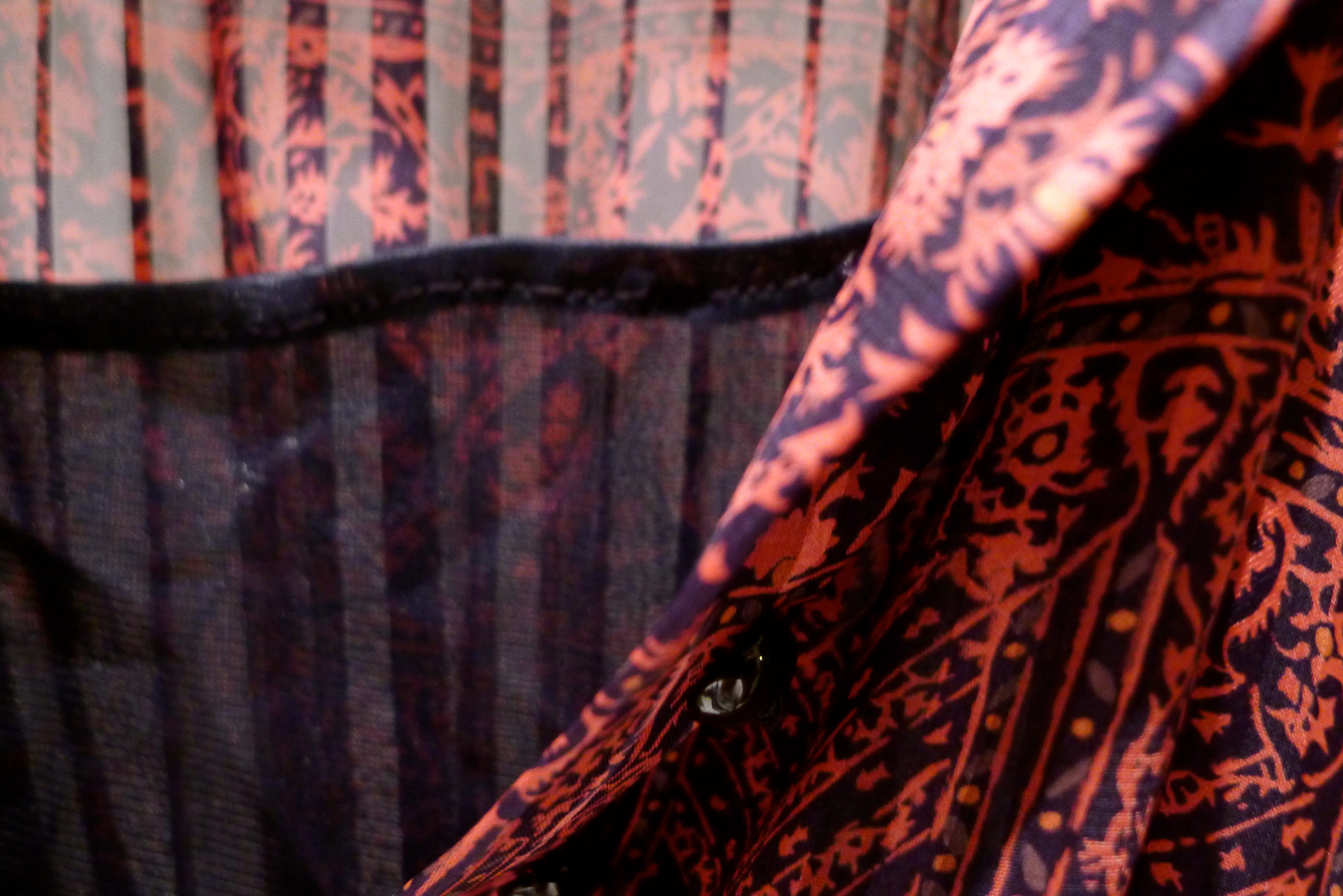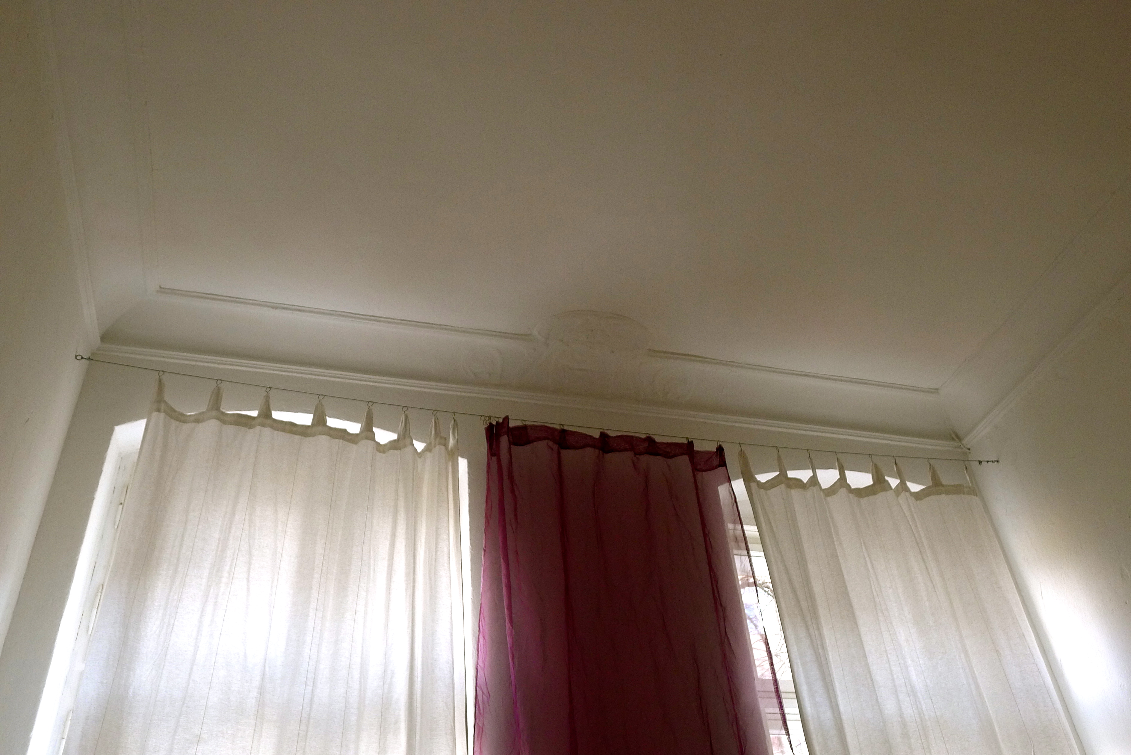 Mot sovrummet finns ingen dörr men väl ett dörrmönstrat tyg, ett dörrdraperi.
